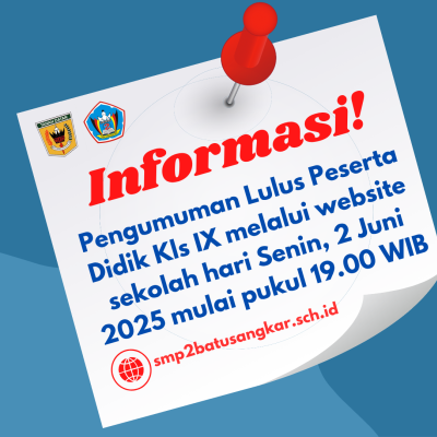 𝗜𝗡𝗙𝗢𝗥𝗠𝗔𝗦𝗜 KELULUSANDengan berakhirnya seluruh rangkaian kegiatan pembelajaran dan evaluasi untuk Tahun Pelajaran 2024/2025, UPT SMPN 2 Batusangkar akan melaksanakan pengumuman