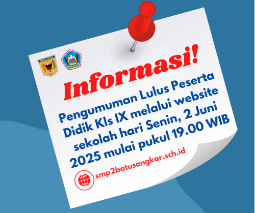 Sehubungan dengan hal tersebut, kelulusan peserta didik UPT SMPN 2 Batusangkar akan diumumkan pada hari Senin, 2 Juni 2025 pukul 19.00 WIB. Proses pengumuman akan dilakukan secara daring (online) melalui website ini. Pengumuman kelulusan dimaksud dapat diakses DISINI atau tautan BERIKUT